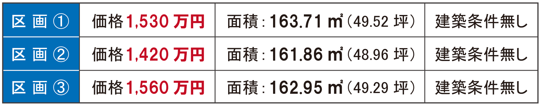 【 土地面積 】 ①区画 公簿16371㎡(48.96坪)・②区画 公簿161.86㎡(48.96坪)・③区画 公簿162.95㎡(49.29坪)