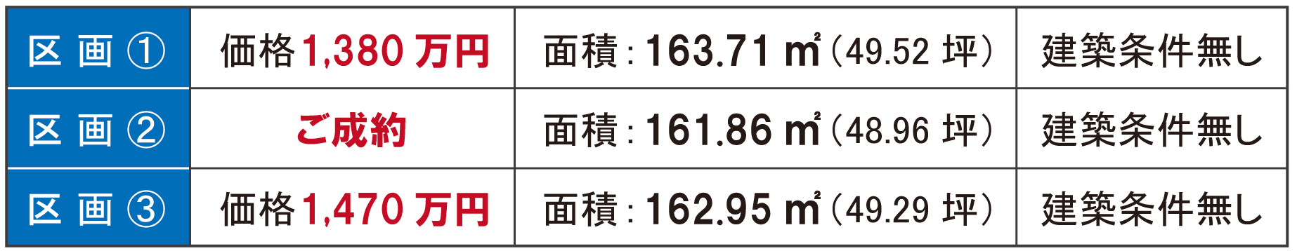 【 土地面積 】 ①区画 公簿163.71㎡(48.96坪)・②区画 公簿161.86㎡(48.96坪)・③区画 公簿162.95㎡(49.29坪)